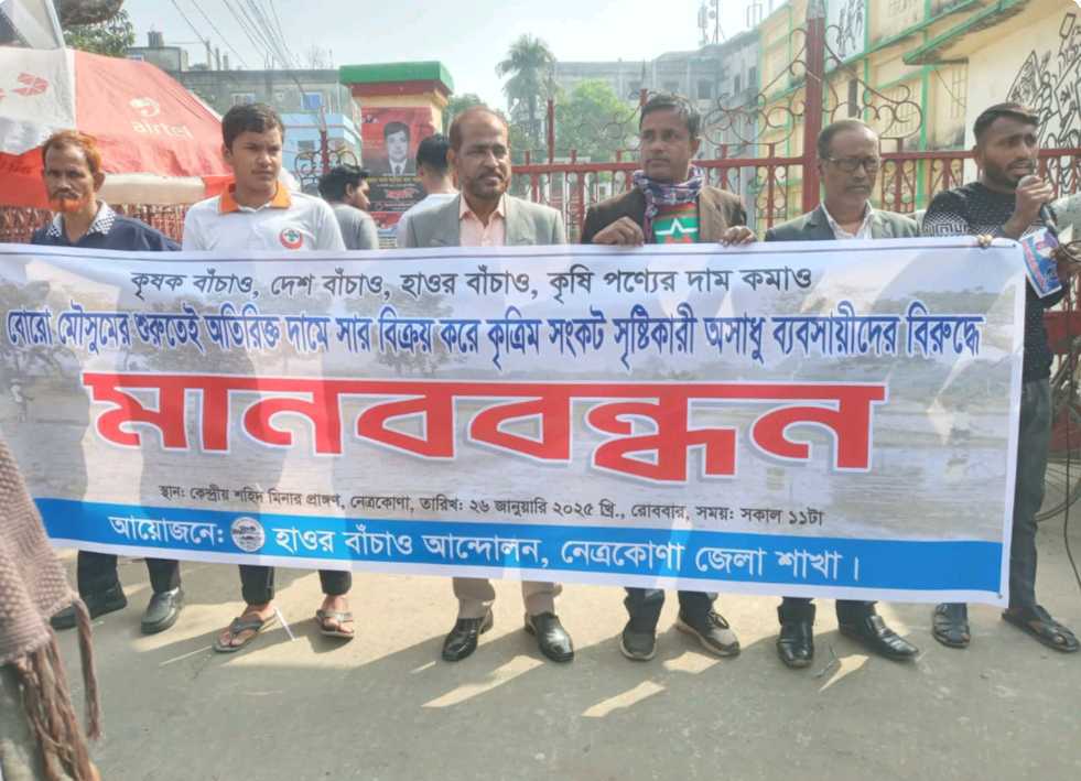 নেত্রকোণা কেন্দ্রীয় শহীদ মিনার প্রাঙ্গণে হাওর বাঁচাও আন্দোলন নেত্রকোণা জেলা শাখার আয়োজনে এ মানববন্ধন কর্মসূচি পালন করা হয়।