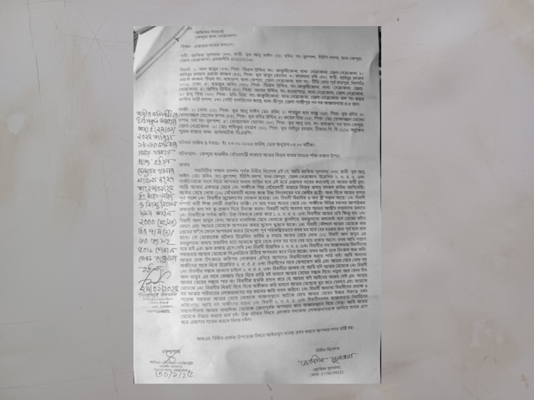 মামলার বিরণে উল্লেখ, ঘটনার দিন ২৩-০১-২০২৫ সময় অনুমান ০৫.০০ ঘটিকায় বদির একমাত্র কন্য নোহাকে বাদীর বাসার পাশে জুয়েলারি ব্যাবসায়ী মদনপুর ইউনিয়নের কাকনিকোণা গ্রামের মিরাজ উদ্দিনের ছেলে ১ নং বিবাদি আল মামুন (৩৩ ), প্রায়ই কু প্রস্তাবসহ আপত্তিকর কথা বার্তা বলে আসছিল ধীর্ঘদিন ধরে। । ভিকটিম নোহাকে মন ভূলানো কথা বলে প্রেমের ফাঁদে ফেলে তার নাবালিকা মেয়েকে অপহরণের সুযোগ খুঁজতেছিল। ঘটনার দিন ভিকটিম নোহা (১২ ) বাদিকে ঘুমের মধ্যে রেখে রাস্তার মধ্যে চলে আসে। মামলার বাদী সজাগ হয়ে রাস্তায় এসে দেখেন ১ নং বিবাদী আল মামুন (৩৩ )সহ আরও পাঁচ জন বিবাদীর সহায়তায় সিএনজি করে তার মেয়ে নোহাকে নিয়ে পালিয়ে গেছে। পরবর্তীতে বাদীর ডাক চিৎকারে সাক্ষীগণ আসলেও ভিকটিম নোহাকে উদ্বার করকে পারেননি। কেন্দুয়া থানা মামলা নং ২৭ তারিখ ২৯/০১/২০২৫ইং। ধারা নারী ও শিশু নির্যাতন দমন আইন ২০০০ (সং/২০ ) এর ৭/৯ (১) ৩০ তৎসহ ৫০৬ পেনাল কোড।