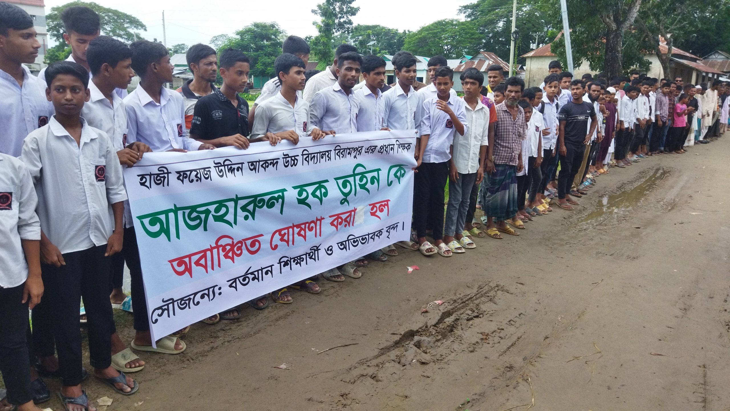 আজ বুধবার সকাল ১১টার দিকে বিদ্যালয়ের শিক্ষার্থীরা ক্লাস বর্জন করে প্রধান শিক্ষক আজহারুল হক তুহিনের অপসারণের দাবীতে বিদ্যালয়ের সামনের সড়কে মানববন্ধন করে।