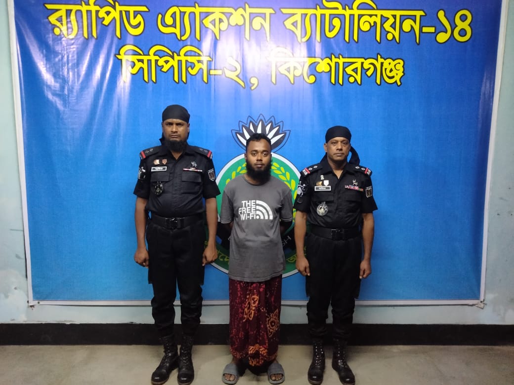 র‌্যাব-১৪ এর সিপিসি-২, কিশোরগঞ্জ কর্তৃক অভিযানে ময়মনসিংহ সি.আর মামলার ১২,০০,০০০/- টাকা জরিমানা এবং এক বছর কারাদন্ড সাজাপ্রাপ্ত পলাতক আসামী প্রতারক মিনহাজকে আটক।