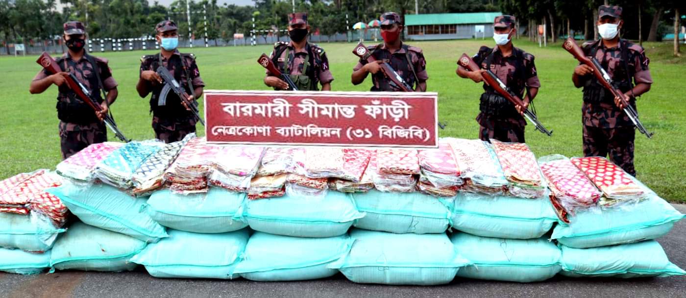 বর্ডার গার্ড বাংলাদেশ, নেত্রকোনা ব্যাটালিয়ন (৩১ বিজিবি) ভারতীয় সীমান্তবর্তী নেত্রকোনার উত্তর বারোমারী এলাকায় টহল দান কালে ৫২ লক্ষ ৮১ হাজার টাকা মূল্যমানের বিপুল পরিমান ভারতীয় শাড়ী আটক করেছে।