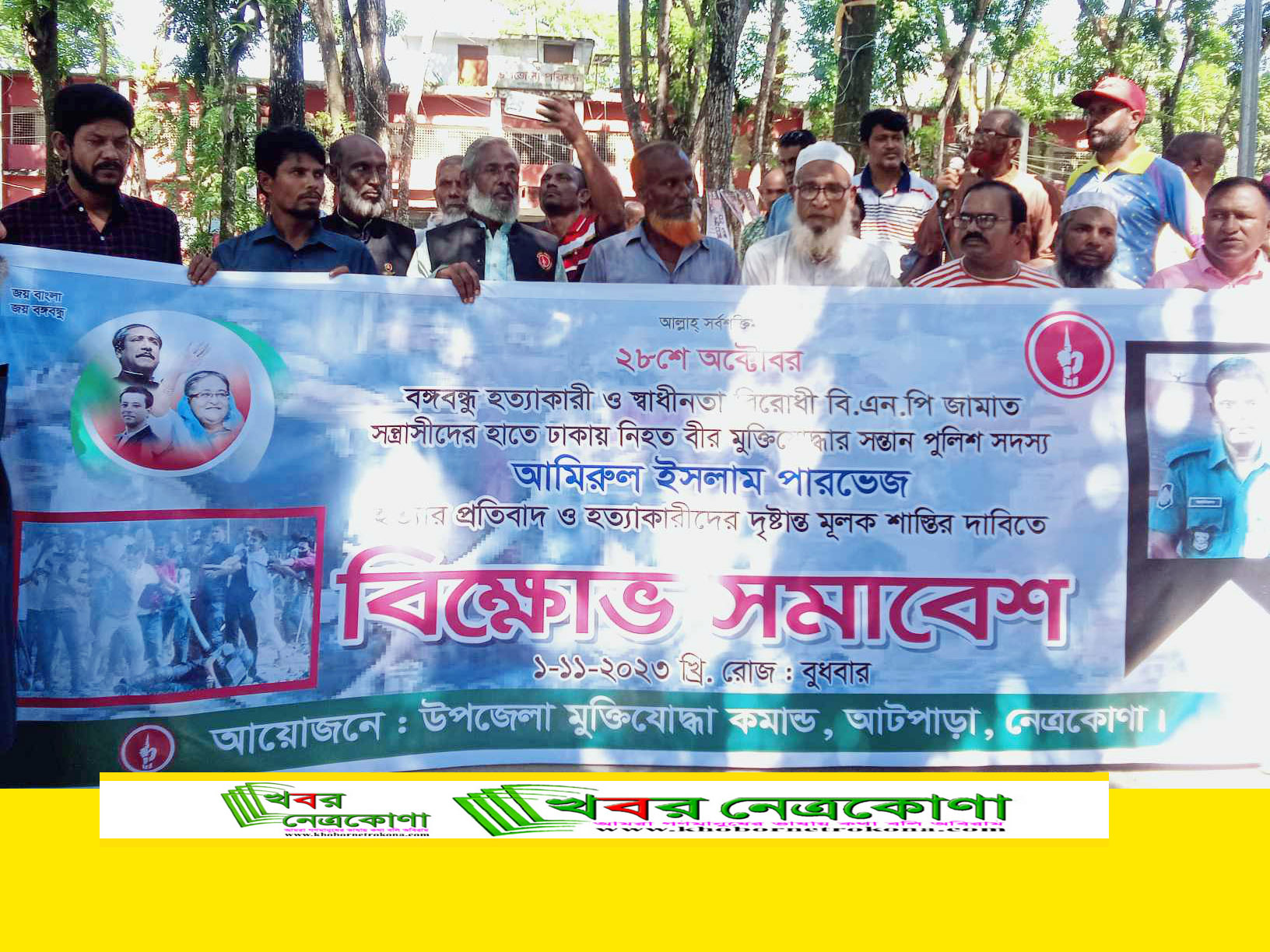 ২৮ অক্টোবর, বীর মুক্তিযোদ্ধার সন্তান পুলিশ সদস্য আমিরুল ইসলাম পারভেজ হত্যার প্রতিবাদ ও হত্যাকারীদের দৃষ্টান্তমূলক শাস্তির দাবিতে বাংলাদেশ মুক্তিযোদ্ধা আটপাড়া উপজেলা শাখা কৃতক এবং উপজেলা মুক্তিযোদ্ধা সন্তান সংসদ ও সন্তান কমান্ড আয়োজনে নেত্রকোনার আটপাড়ায় বিক্ষোভ সমাবেশ অনুষ্ঠিত হয়েছে। বুধবার সকাল ১১ টায় উপজেলা পরিষদ চত্বরে এ বিক্ষোভ মিছিল অনুষ্ঠিত হয়।